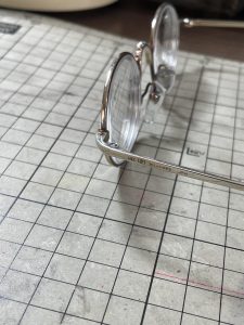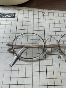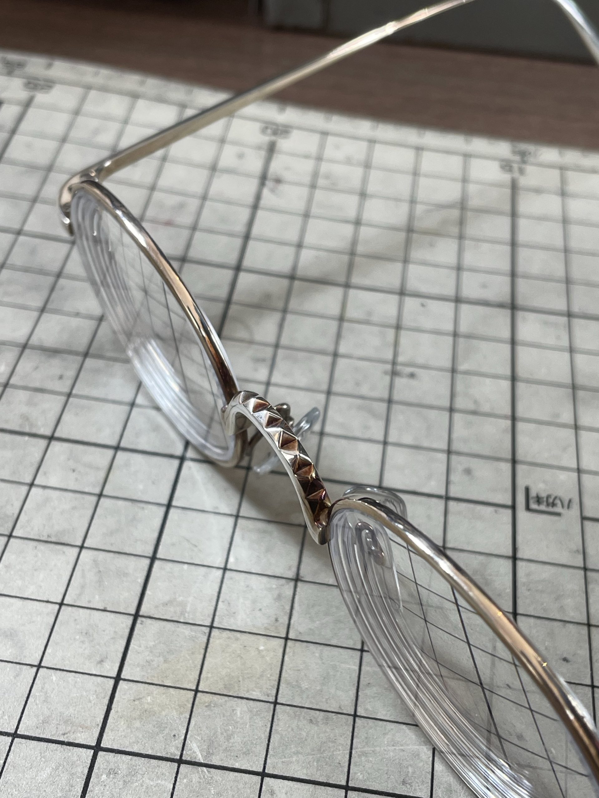 トップ画像はブリッジの様子です。スタッズの陰影がクッキリしました。加えて、レンズ周りが黒ずみました。キラキラ感が減って、メガネ全体に落ち着いた雰囲気を与えています。