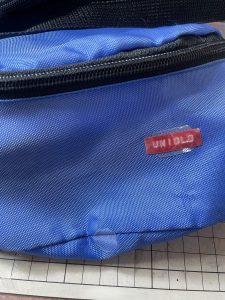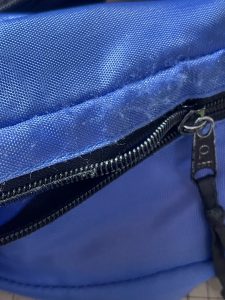 表面の解れ穴あきは、使用半年くらいで。財布の角や鍵の先っちょで突いているんでしょうね。ナイロン修理専用の頑丈な透明テープを貼ってやり過ごしていました。その上に何となくダイモテープでUNIQLOって貼っていました。なんかカッコ良かったのでつい。